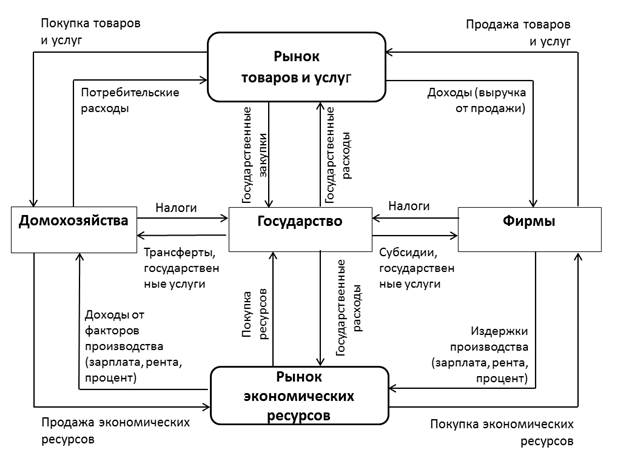 Домашние хозяйства, продавая принадлежащие им на правах частной собственности факторы производства, получают доход. На полученные доходы, состоящие из заработной платы, процента и ренты, они приобретают необходимые товары и услуги. Фирмы, покупая на рынке ресурсов у домашних хозяйств труд, землю, капитал, производят товары, которые продают на рынке товаров в ответ на предъявляемый домашними хозяйствами платёжеспособный спрос, образуемый доходами, полученными домашними хозяйствами. Государство выполняет функции как фирм, так и домохозяйств, но при этом выполняет ещё и функцию перераспределения доходов в экономической системе.