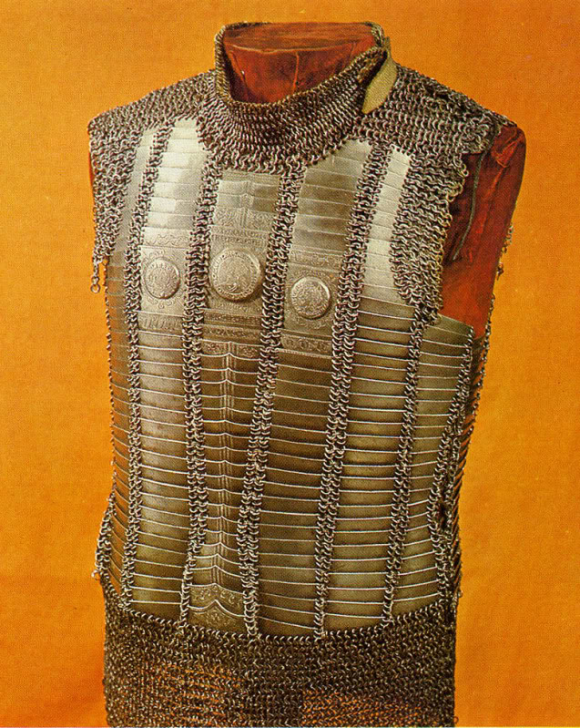 Этот вид доспеха сплетен из множества металлических колечек, защита представляет собой полотно металлической сети. Кольчуга имела разные названия, ее называли яцерином, байданой, панцырем.