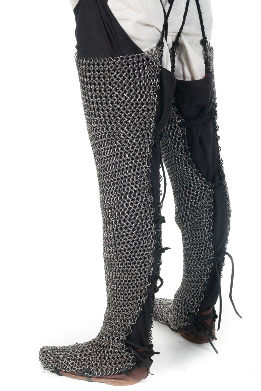 Кольчужные чулки, по всей вероятности крепились к поясу, на двойную завязку, кожаным шнуром. Наружная часть всегда была из кольчужного полотна. Внутренняя сторона стопы была либо кольчужная с несколькими шнурками, для придания анатомичности чулкам. Либо имелась шнуровка, которая затягивалась позади чулков и тем самым фиксировала их на ноге (Рис. 26) [26]