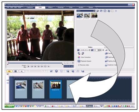 После этого клипы перенести по технологии Drag and Drop (Перетащить) из библиотеки на монтажный стол. На рисунке фильм представлен в режиме Раскадровки.