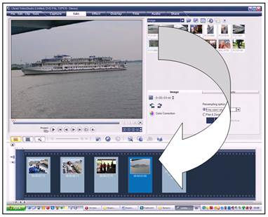 Вначале необходимо загрузить импортируемые фотографии в библиотеку редактора. Для этого нужно в списке библиотек выбрать пункт Image (Изображения) и с помощью кнопки Load image (Скачать изображения) указать путь к фотографиям. Затем фотографии нужно «перетащить» на монтажный стол. В изучаемый редактор можно загрузить статические изображения в форматах: JPG, GIF, PNG, WMF, BMP, TIF, PSD и др.