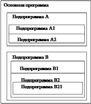 В рассмотренном выше примере из основной программы можно обратиться к подпрограммам А и В, но нельзя вызвать ни одну из вложенных в них процедур А1, А2, В1, В2 и В21.
