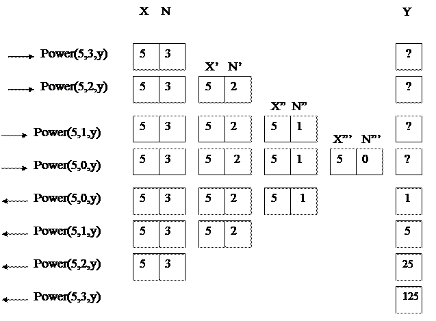 Проследим за состоянием памяти в процессе выполнения вызова данной процедуры Power(5,3,Y). Стрелка «®» означает вход в процедуру, стрелка «» означает выход из нее.