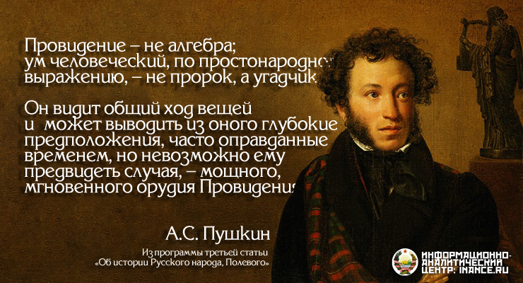 Провидение — не алгебра; ум человеческий, по простонародному выражению, — не пророк, а угадчик. Он видит общий ход вещей и может выводить из оного глубокие предположения, часто оправданные временем, но невозможно ему предвидеть случая, — мощного, мгновенного орудия Провидения.