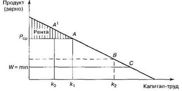Аргументацию Рикардо можно представить следующим образом (рис. 2). Допустим для упрощения, что общественный продукт состоит целиком из зерна - главного источника продовольствия. Предположим также, что этот продукт создается за счет приложения к земле капитала, который используется главным образом для найма работников, так что «порция» капитала — это одновременно «порция» труда, и наоборот. Капиталовооруженность труда предполагается одинаковой для всех порций такого «капитала-труда».