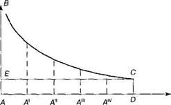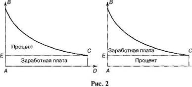тор», который Кларк условно называет «капиталом») и будем посл(доиательно увеличивать количество работников на единицу6 до тех пс пока не исчерпаем всю рабочую силу в данной стране. В результа получим ту же картину убывающей отдачи или «падения конечнС производительности труда». Площадь под этой падающей кривой ABC (рис. 1) представляет собой весь продукт труда, оснащенного «капит лом». В то же время поскольку все приращения труда равноценны 1 качеству, то в силу конкуренции нанимателей между собой и работн! ков между собой заработная плата или «продукттруда самого по сеЕ как уже отмечалось, будет тяготеть к конечному (предельному) nf дукту труда. Она измеряется площадью прямоугольника (AECD), ст ронами которого являются количество единиц труда и предельш продукттруда. Площадь ЕВСв данном случае представляет собой «pi кг| ный доход капитала», т.е. процент (рис. 2а).