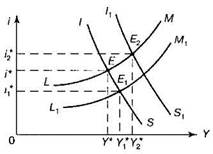 Когда экономика находится в положении, близком к ситуации ликвидной ловушки (т.е. левая часть кривой LM параллельна OY), увеличение массы денег не может существенно повлиять на процент — кривая LM сдвигается вправо, но ее левая часть остается практически неизменной. Денежная политика малоэффективна. Если в такой ситуации предельная эффективность капитала возрастает, а величина мультипликатора не уменьшается (кривая IS сдвигается вправо), происходит прежде всего увеличение дохода, а следовательно, и занятости, а не процента. Если, напротив, предельная эффективность падает и не происходит компенсирующего увеличения мультипликатора (кривая fS сдвигается влево), падение дохода, а следовательно, и занятости, становится неизбежным (рис. 2).