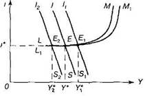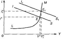 а следовательно, при заданной ставке заработной платы, и уровень занятости. Если произойдет увеличение массы денег (кривая LM сдвинется вправо), процент понизится (i*< Г), а доход увеличится (У^> Г). Рост дохода может иметь место и в результате повышения предельной эффективности капитала (кривая IS сдвигается в положение /Д), но в этом случае процент повысится (Y*> Y*, /* > Г).