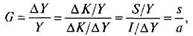где С — темп прироста дохода или выпуска продукции, У— доход i выпуск продукции, К— капитал, S— сбережения, /- инвестиции, i определению равные приросту капитала АХ", по условию равные c6d режениям; s — доля сбережений в доходе; а — коэффициент прирос!