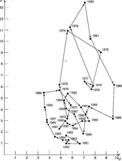 До 60-х годов проблема взаимосвязи уровня производства и цен в и и! юм виде практически не ставилась, Кейнсианцы не занимались к проблемой в силу преобладающего интереса к воздействию кре-по-денежной политики на реальный сектор, хотя сам Кейнс до-кал, что увеличивающийся агрегированный спрос должен частич-фоявляться в росте издержек, а частично — в увеличении объема шзводства. Неоклассики игнорировали эту проблему, потому что цдили из предпосылки о полной занятости ресурсов. Они связы-п рост денежной массы с повышением цен, хотя и не исключали можность временного увеличения производства. В любом случае i цен в условиях большого количества незанятых ресурсов не рас-i ривался ими как самостоятельная проблема. Ликвидировать этот ирииел и попытались монетаристы, используя кривую Филлипса.