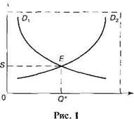 Равновесие в модели добровольного обмена. Кривые Д, и £>2суть графики функций спроса индивидов 1 и 2 на общественное благо, OS— доля налога, упла-чинаемого индивидом 1, SP - доля налога, уплачиваемая индивидом 2. Уменьшение доли налоговдля каждого индивида (которое можно проиллюстрировать перемещением точки 5 вдоль оси абсцисс) обусловливает возрастание величины спроса на общественное благо. Равновесие по Линдалю достигается в точке Е, при объеме предоставления общественных благ Q* и распределении налогового бремени в пропорции OS: SP,