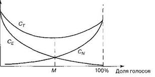 Издержки процесса голосования. Кривая CN — график функции трансакци-1 онных издержек, связанных с достижением согласия; кривая СЕ — график! функции издержек, связанных с возможностью принятия решения, ущем-| ляющего интересы части индивидов (и случае голосопания по правилам, от-1 личным от правила единогласия); крипая СТ — график функции сопокvm-| ных издержек Точка М соответствует минимуму совокупных издержек.