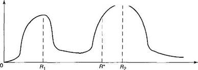 Распределения подобного рода называются бимодальными10. При бимодальном распределении оптимальные позиции партий соответствуют не «медианной» позиции R*, которая не обеспечивает максимизации числа голосов, а модальным позициям R[ и /^. В иллюстрируемом случае преимущество будет иметь партия, анонсирующая объем расходов £, (например, партия 2). Вместе с тем у партии-конкурента (партии 1) отсутствуют стимулы анонсировать позицию, отличную от Л,, поскольку в противном случае в борьбу может вмешаться новая партия, которая оттеснит партию 1 из числа лидеров '. Таким образом,