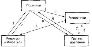 Схема взаимодействия субъектов политического рынка. В демократической системе избиратели делегируют полномочия принятия решении о проведении экономических мероприятий политикам (1). Часть решений политики принимают самостоятельно, оказывая тем самым воздействие на благосостояние избирателей (2), а часть — делегируют чиновникам (3), от решений которых также зависит благосостояние избирателей (4). В свою очередь группы давления осуществляют воздействие на решения политиков и чиновников, предоставляя им специфическую поддержку (связи 5 и 6) с целью добиться проведения выгодных для себя мероприятии (связи 7 и 8) Более сложная структура связей включает в себя также мероприятия политической рек-памы, осуществляемые политиками и группами давления с целью оказать влияние на позицию избирателей (связи 9 и 10).