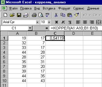 В MS Excel для вычисления парных коэффициентов линейной корреляции используется специальная функция КОРРЕЛ (массив1; массив2),