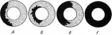 А, Б и В - частичные секвестры: А - корковый секвестр, Б - центральный секвестр, В - проникающий секвестр; Г- тотальный секвестр.