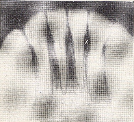 | Рис. 7. Деструкция твердых пластинок межзубных перегородок в области 31, 32, 41, 42 зубов, остеопороз. Высота перегородок находится на уровне эмалево-цементной границы. На смежных поверхностях коронок 31 и 32 зубов выступающие проекции зубного камня. Рис. 8. Область 31, 32, 41, 42 зубов. Высота межзубных перегородок на уровне эмалево-цементной границы, вершины их нечеткие. Периодонтальная щель у шеек 31 и 41 зубов расширена. |