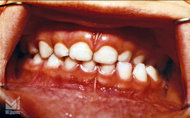 | Рис. 3. Хронический генерализованный катаральный гингивит пубертатного возраста. (К05.10. Хронический гингивит. Простой маргинальный). Отек и цианотичность десневого края и десневых сосочков. |