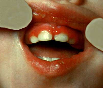 | Рис. 1. Острый катаральный гингивит. Десневые сосочки и край десны отечны, гиперемированы, легко кровоточат. Рис. 1.1. Гингивит прорезывания. Слизистая оболочка десны вокруг прорезывающихся зубов гиперемированна и имеется незначительный отек. Процесс прорезывания сопровождают чувство зуда и жжения, повышено слюноотделение. |