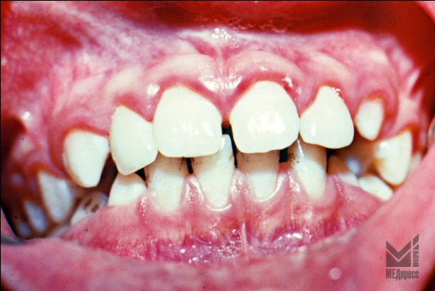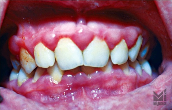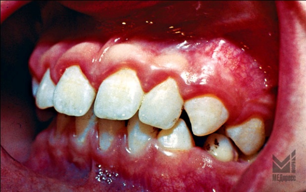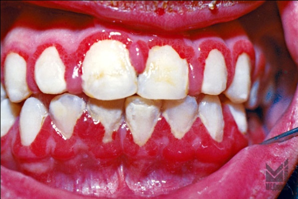 | Рис. 5. Гипертрофический гингивит пубертатного возраста. (К05.11 Хронический гингивит гипертрофический). Десневые сосочки и десневой край гипертрофированы и цианотичны с участками десквамативного эпителия Ложные десневые карманы. |