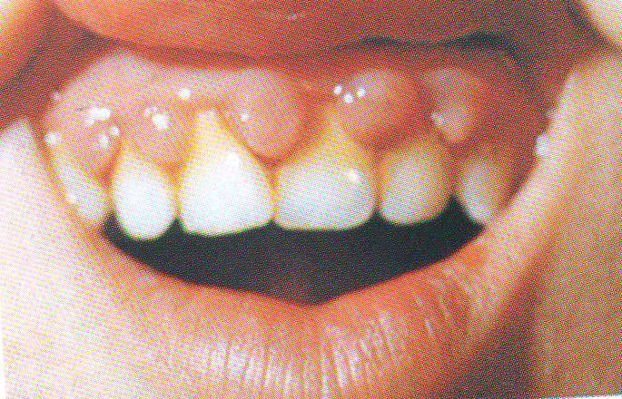 | Рис. 4. Хронический гипертрофический гингивит. Десневые сосочки увеличены в размерах, плотные (степень гипертрофии I-II). Зубной камень |