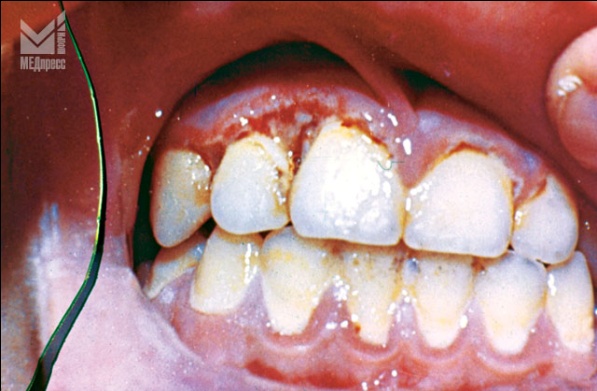 | Рис. 7 Язвенный гингивит (К05.08 язвенный гингивит). Десневой край гиперемирован по краю десны язвенно-некротический процесс. В области 11 и 12 зубов десневой сосочек разрушен, раневая поверхность покрыта серым налетом. |