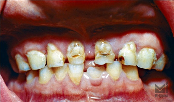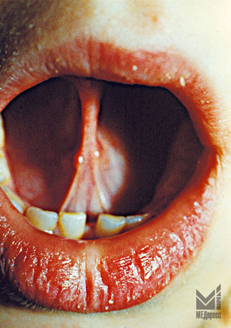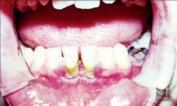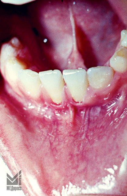 | Рис. 3.Сильная уздечка языка приводит к локализованному пародонтиту, нарушению положения фронтальных зубов нижней челюсти и способствует формированию дистальной окклюзии. |