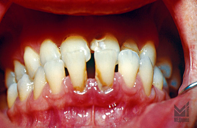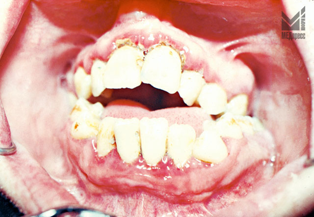 | Рис. 7.Открытый прикус. Деформация челюстей и десневого края. Застойная гиперемия, отек. Оголение шеек центральных резцов, зубной камень.