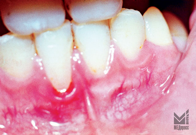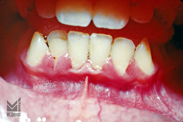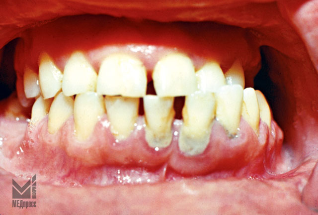 | Рис. 9. Тесное положение зубов. Отек и гиперемия десневого края у нижних резцов. Валикообразный десневой край у 31.
