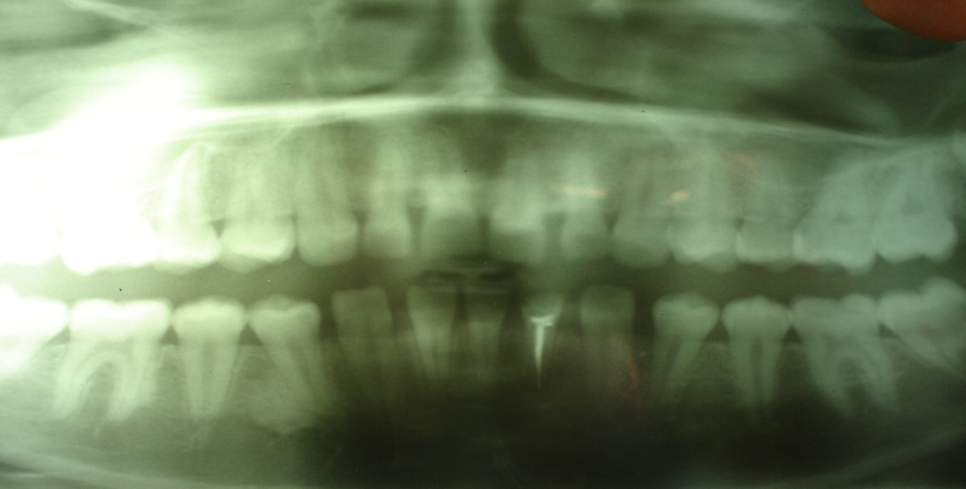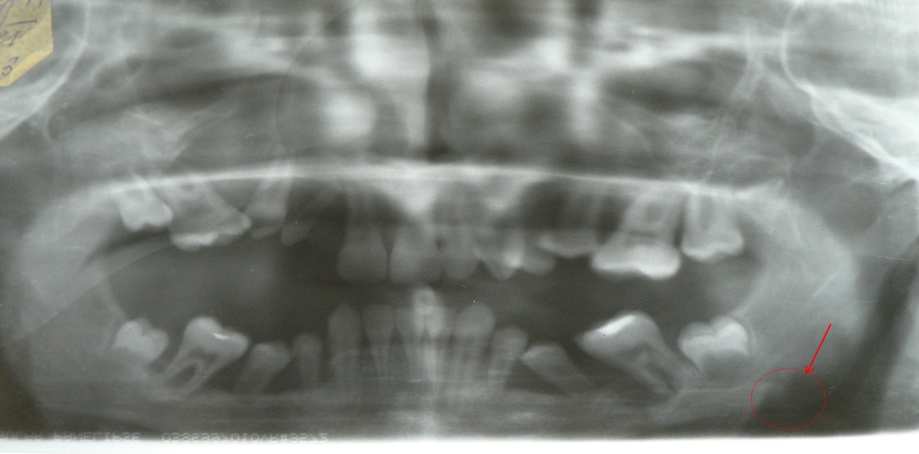 На ортопантомограмме удовлетворительного качества определяется фолликул 48-го зуба, стадия минерализации зачатка – колпачок, 47 зуб – верхушки корней не сформированы. 46 зуб – корни сформированы. Вдоль медиального корня полоска затемнения четко выраженная с фестончатыми контурами с небольшими участками просветления. 45 зуб – корень не сформирован. 44 зуб - верхушка корня сформирована. У дистальной поверхности корня определяется образование большой плотности, охватывающее 2/3 поверхности корня. На фоне плотных полей имеются участки с меньшей контрастностью. Границы новообразования фестончатые. В нижнем отделе прослеживается полоса просветления, которая отделяет его от неизмененной кости. В среднем и верхнем отделах полоса просветления отсутствует. Периодонтальная щель не прослеживается. Корни клыков, центральных и боковых зубов сформированы. 31 зуб – корневой канал запломбирован на всем протяжении. Адентия 32-го зуба. Корни 33, 34 зубов сформированы. Корень 35-го зуба не сформирован. Корень 36-го зуба сформирован. 37 зуб в стадии незакрытой верхушки. Фолликул 38-го зуба - стадия минерализации – колпачок. В боковых отделах жевательной группы зубов межзубные перегородки на уровне эмалево-цементной границы, четко выражены их вершины. Фронтальный отдел нижней челюсти – отсутствие вершин межзубных перегородок, явления остеопороза. Верхняя челюсть – верхушки 13 и 23го зубов не закрыты. Снижение высоты межзубных перегородок в области фронтальных зубов снижена, деструкция вершин и остеопороз межзубных перегородок.