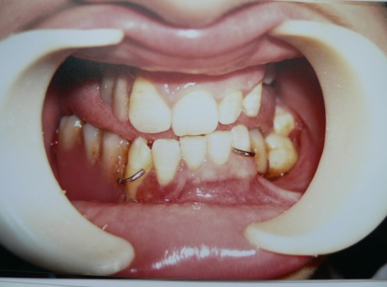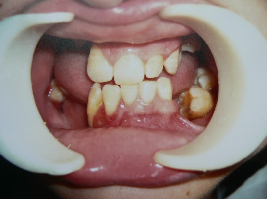 Преддверие полости рта мелкое - 3 мм. Уздечка верхней губы вплетается в десну на границе свободной и прикрепленной частей. Уздечка нижней губы короткая. Нарушен рельеф десневого края.