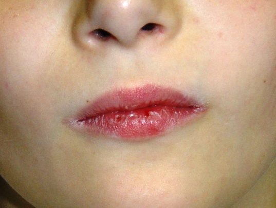 Конфигурация губ не нарушена. Красная кайма губ гиперемирована, слегка инфильтрирована, сухая, покрыта мелкими чешуйками сероватого оттенка. В углах рта заеды (рис.1). Отмечается вредная привычка – прикусывание нижней губы. Открывание рта затруднено вследствие сухости красной каймы губ и болезненных заед.
