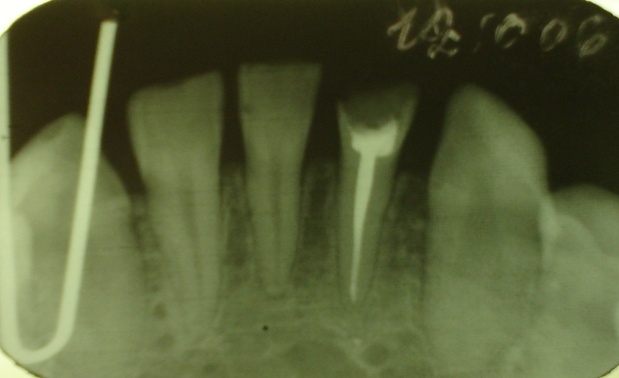 На внутриротовой контактной рентгенограмме удовлетворительного качества в области 42,41,31 зубов определяется дефект коронки 31-го зуба, полость зуба заполнена рентгеноконтрастным пломбировочным материалом, корневой канал запломбирован на всю длину, периодонтальная щель прослеживается на всем протяжении. В области всех зубов определяется деструкция вершин и остеопороз, снижение высоты межзубных перегородок.