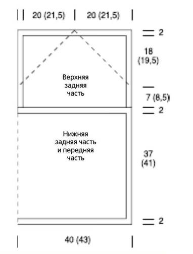 Описание работы: на спицы № 5 набрать 145 (157) п. и связать 6 р. = 2 см жемчужным узором. Далее вязать следующим образом: 4 п. жемчужным узором, 135 (147) п. изн. гладью, 4 п. жемчужным узором. Через 39 (43) см от наборного края вязать 6 р. следующим образом: 73 (79) п. жемчужным узором, 66 (72) п. изн. гладью, 4 п. жемчужным узором. Через 41 (45) см от наборного края на первых 73 (79) п. вязать для задней части следующим образом: кром., 4 п. жемчужным узором, 63 (69) п. изн. гладью, 4 п. жемчужным узором, кром, Одновременно для передней части закрыть последние 72 (78) п. Через 66 (73) см от наборного края связать на всех петлях еще 6 р. жемчужным узором и петли закрыть.