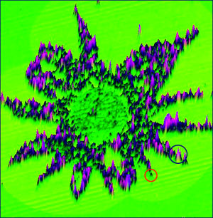 3D АСМ-изображение агрегатов белка (цитохром P450 Bm3).Синим и красным выделены, соответственно, олигомеры имономеры белка в структуре агрегата