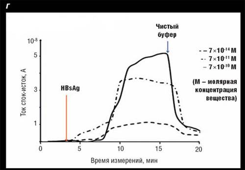Г) Регистрация поверхностного антигена (HBsAg) вируса гепатита В в реальном времени. При добавлении HBsAg (момент ввода показан стрелкой) формируется биоспецифический комплекс антиген/антитело, что вызывает повышение проводимости нанопровода. При замене раствора антигена на чистый буфер без белка, антиген десорбируется с чипа, и проводимость нанопровода понижается к исходному состоянию.