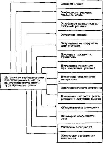 Следствием такого нарушения является искажение всех тех видов деятельности, в которых используется вероятностная структура прошлого опыта,— будь то «простая» ориентировочная реакция или «сложная» речевая или ассоциативная деятельность (см. схему на стр. 91).