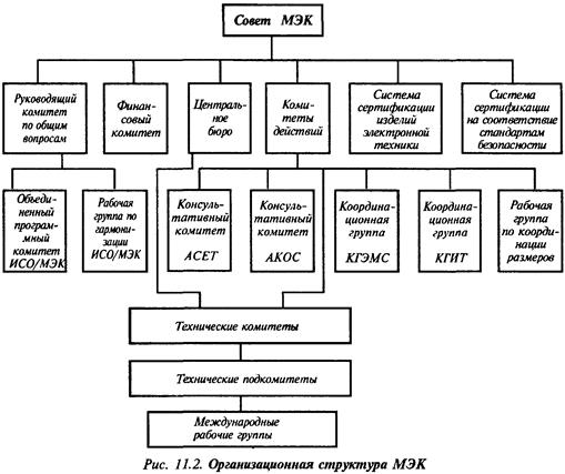 В подчинении Комитета действий работают консультативные группы, которые Комитет вправе создавать, если возникает необходимость координации по конкретным проблемам деятельности ТК. Так, две консультативные группы разделили между собой разработку норм безопасности: Консультативный комитет по вопросам электробезопасности (АКОС) координирует действия около 20 ТК и ПК по электробытовым приборам, радиоэлектронной аппаратуре, высоковольтному оборудованию и др., а Консультативный комитет по вопросам электроники и связи (АСЕТ) занимается другими объектами стандартизации. Кроме того, Комитет действий счел целесообразным для более эффективной координации работы по созданию международных стандартов организовать Координационную группу по электромагнитной совместимости (КГЭМС), Координационную группу по технике информации (КГИТ) и Рабочую группу по координации размеров (рис. 11.2).