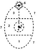 Психосинтез – динамическая концепция психической жизни человека, разработанная итальянским психологом Р. Ассаджиоли. Суть ее заключается в определенном подходе к строению и функционированию внутреннего мира человека. Схематично внутренний мир человека представлен в виде сферы (монады) и состоит из низшего (1), среднего (2) и высшего (3) бессознательного, поля сознания (4), сознательного «Я» – Эго (5) и высшего «Я» (6). Монада погружена в поле коллективного бессознательного – окружающую психическую среду (7). Оболочка сферы проницаема, как мембрана, что обеспечивает процессы взаимного влияния человека и среды.