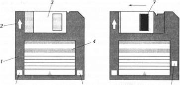 Блокировка записи на диск устанавливается специальным переключателем (пластиковой заслонкой), размещенным в левом углу футляра дискеты. Диск защищен от записи, когда окно открыто; если заслонка закрывает отверстие, то запись разрешается.