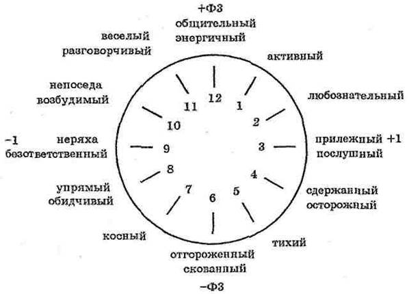 «обидчивость» содержит как компонент и «ЗАТОРМОЖЕННОСТЬ», и «БЕСПОРЯДОЧНОСТЬ», но последний компонент — с большим весом. Исходя из этого размещения «обидчивости» на циркограмме, можно предположить, что к проявлениям обидчивости могут быть максимально склонны дети, обладающие низким уровнем сознательного самоконтроля над поведением (— Ф1 «БЕСПОРЯДОЧНОСТЬ»), во-первых, и определенным уровнем эмоциональной заторможенности (— ФЗ «ЗАКРЕПОЩЕННОСТЬ»), во-вторых.