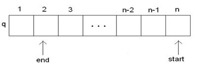 Обычно start указывает на голову очереди, end — на элемент, который заполнится, когда в очередь войдёт новый элемент. При добавлении элемента в очередь в q[end] записывается новый элемент очереди, а end уменьшается на единицу. Если значение end становится меньше 1, то мы как бы циклически обходим массив и значение переменной становится равным n. Извлечение элемента из очереди производится аналогично: после извлечения элемента q[start] из очереди переменная start уменьшается на 1. С такими алгоритмами одна ячейка из n всегда будет незанятой (так как очередь сn элементами невозможно отличить от пустой), что компенсируется простотой алгоритмов.