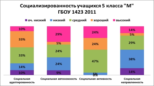 Данное распределение результатов по уровням проявления социализированности более ярко отражают картину в классе. Низкий уровень социальной направленности тем более удивителен, что с первого по четвертый класс учителем была проделана огромная работа по воспитанию коллективизма у учащихся. Полученный результат оказался неожиданным. К тому же с переходом в пятый класс активность учащихся очень часто была направлена на конфликтные отношения (см. гистограмму).