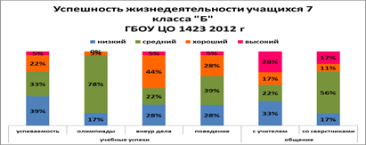 Из представленных на рисунке данных можно сделать вывод, что класс более успешен во внеклассной деятельности, чем в учебной. Только 27% учащихся хорошо учатся, а к районным и городским олимпиадам по предметам интереса не проявляют. Зато 50% школьников участвуют во внеурочной деятельности и 45% имеют хорошие отношения с учителями.