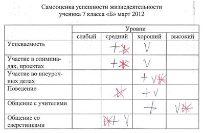 Вот так самооценку своих успехов проводил Александр П. (7 класс). Знаком «+» он оценил свои успехи в данный момент, галочкой – какие успехи он хотел бы иметь, звездочкой отмечено мнение учителя.