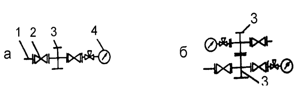 а – для однорядного лифта; б – для двухрядного лифта; 1 – ответный фланец; 2 – запорное устройство; 3 – трубная головка; 4 – манометр с запорно-разрядным устройством.