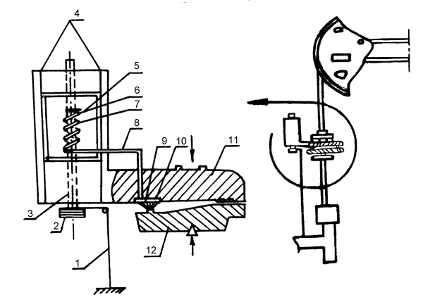 8 – капиллярная трубка, 9 – силоизмерительная камера, 10 – нажимной диск, 11 – месдоза (верхний рычаг силоизмерительной части), 12 – рычаг (нижний) силоизмерительной части.