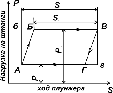 Точка А (рис. 8.3) – начало хода устьевого штока вверх АБ – восприятие нагрузки от веса жидкости после закрытия нагнетательного клапана. Отрезок бБ – потеря хода плунжера в результате удлинения штанг и сокращения труб, отрезок БВ соответствует ходу плунжера вверх. При обратном ходе штока линия ВГ отображает разгрузку штанг от веса жидкости (трубы растянулись, а штанги сократились). В интервале ГА (ход плунжера вниз) нагрузка Рвн равна весу штанг в жидкости, а при ходе вверх Рвв – весу штанг и весу жидкости над плунжером.
