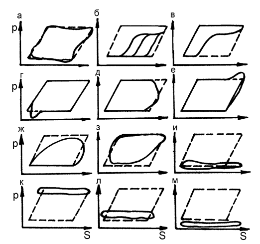 а – нормальная тихоходная работа; б – влияние газа; в – превышение подачи насоса над притоком в скважину; г – низкая посадка плунжера; д – выход плунжера из цилиндра невставного насоса; е – удары плунжера о верхнюю ограничительную гайку вставного насоса; ж – утечки в нагнетательной части; и – полный выход из строя нагнетательной части; к ‑ полный выход из строя всасывающей части; л – полуфонтанный характер работы насоса; м ‑ обрыв штанг (пунктиром показаны линии теоретической динамограммы); з – утечки во всасывающей части.