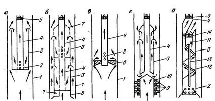 Рисунок 9.1 –Принципиальные схемы газовых якорей: однокорпусного (а), двухкорпусного (б), однотарельчатого (в), зонтичного (г), винтового (д).
